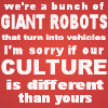 Description: Text reading "We're a bunch of giant robots that turn into vehicles, I'm sorry if our culture is different than yours."
